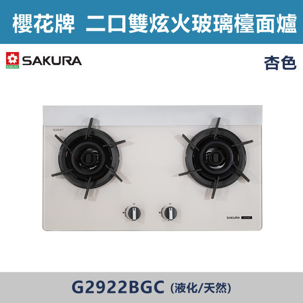 來電優惠 v【櫻花牌】二口雙炫火玻璃檯面爐(杏色/粉色)(液化/天然)- G2922BGC / G2922BGP