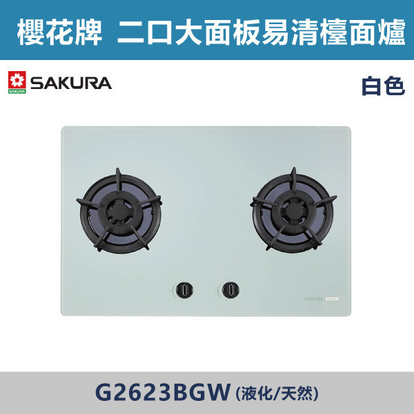 來電優惠v【櫻花牌】二口大面板易清檯面爐-(白色/黑色)(液化/天然)- G2623BGW / G2623BGB